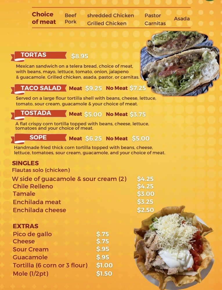 Grilled chicken, asada, pastor or carnitas, topped with onions, cilantro & green salsa